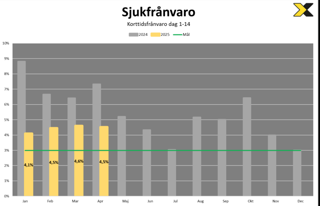 • Sjukfrånvaron har sjunkit och har en positiv trend under 2025 i jämförelse med 2024.